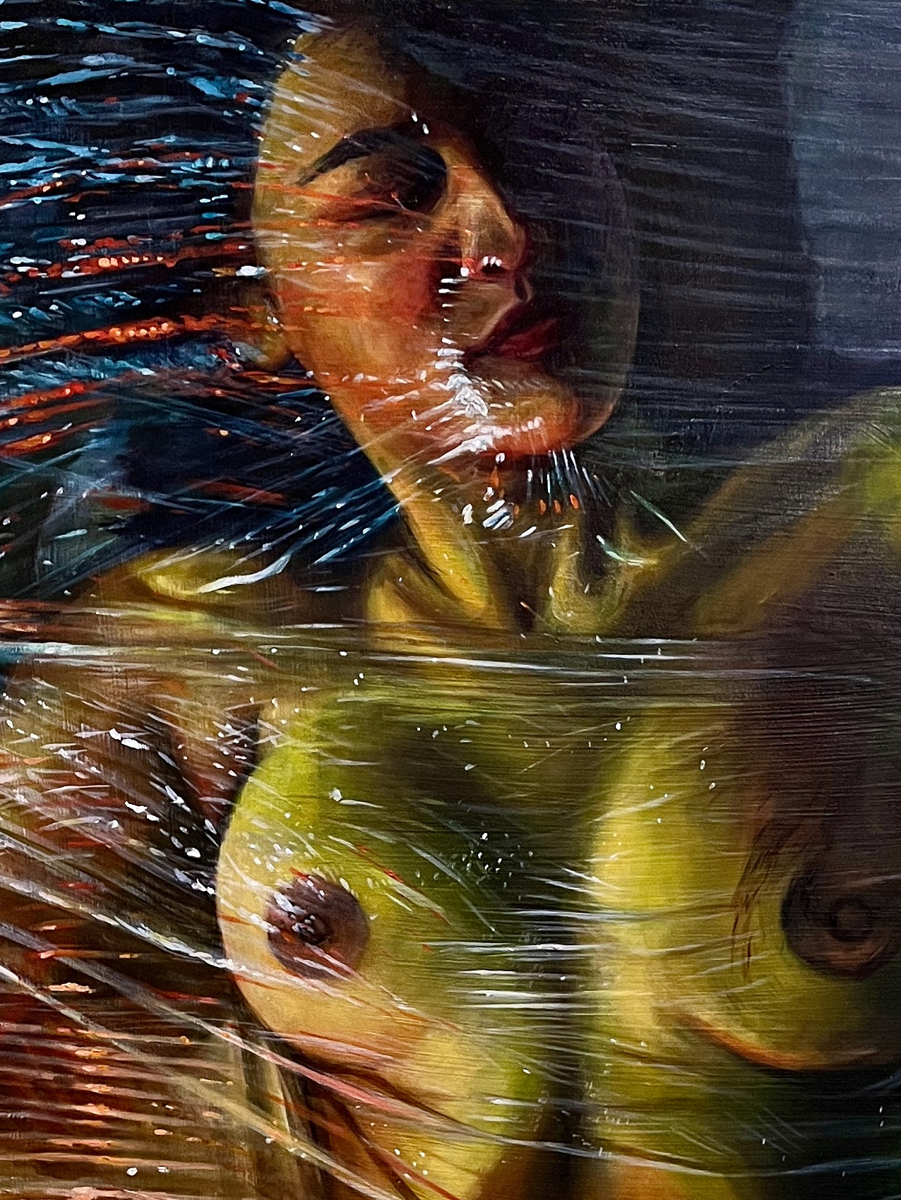 In Meat, Mara Espinosa Erda merges self-acceptance with a critique of women’s objectification in consumer culture. Depicting a female body wrapped in plastic like supermarket meat, the painting confronts the commodification of femininity, urging viewers to question capitalism’s role in dehumanization.