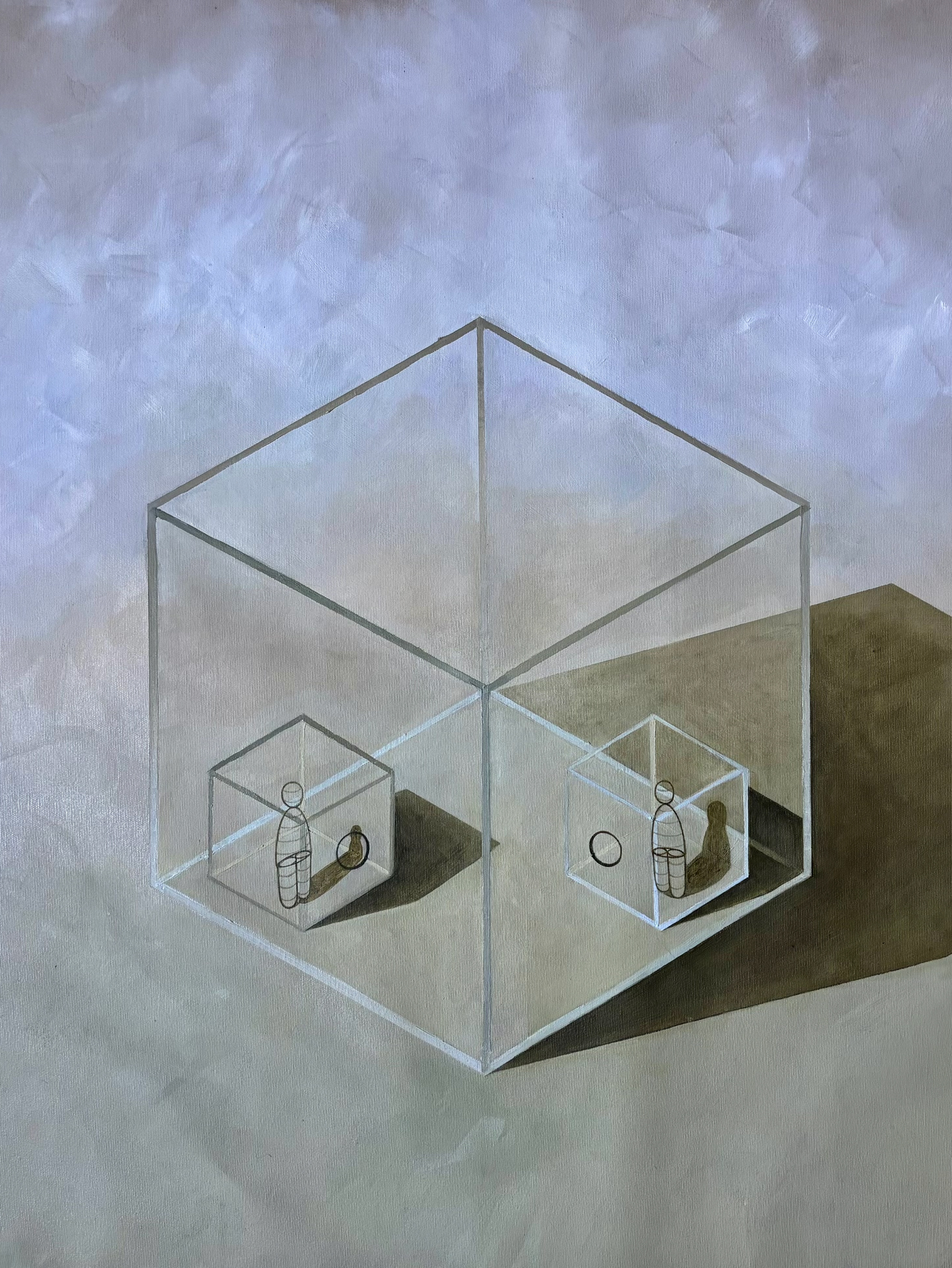 Divergence Point explores the illusion of symmetry and the fragmentation of reality. Mirrored figures sit in transparent cubes, evoking parallel worlds that exist side by side but remain disconnected.