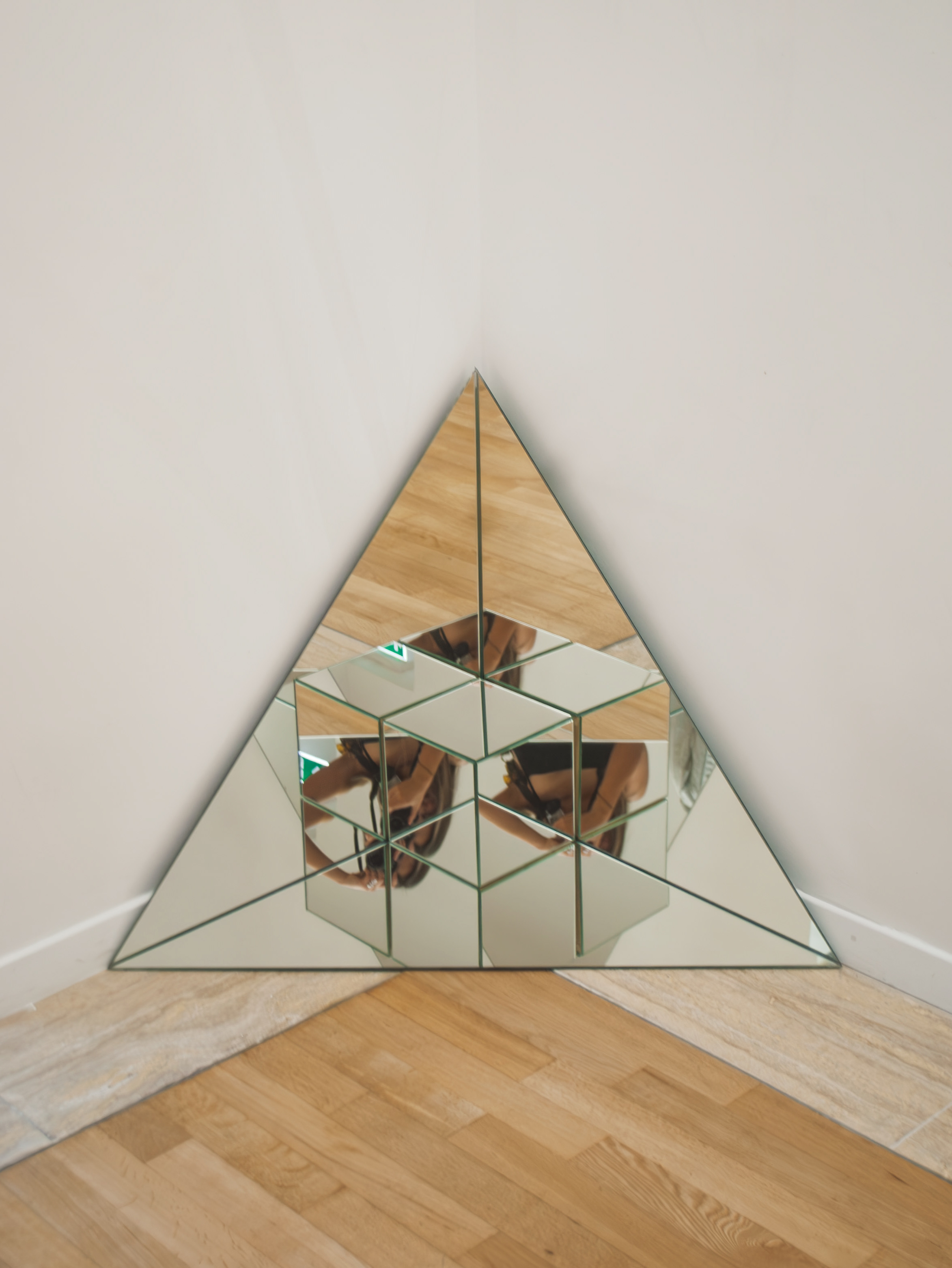 Fragmented Realities is a mirrored installation that invites viewers to see themselves multiplied and fractured across shifting planes of reflection. The work explores the idea of parallel versions of the self.