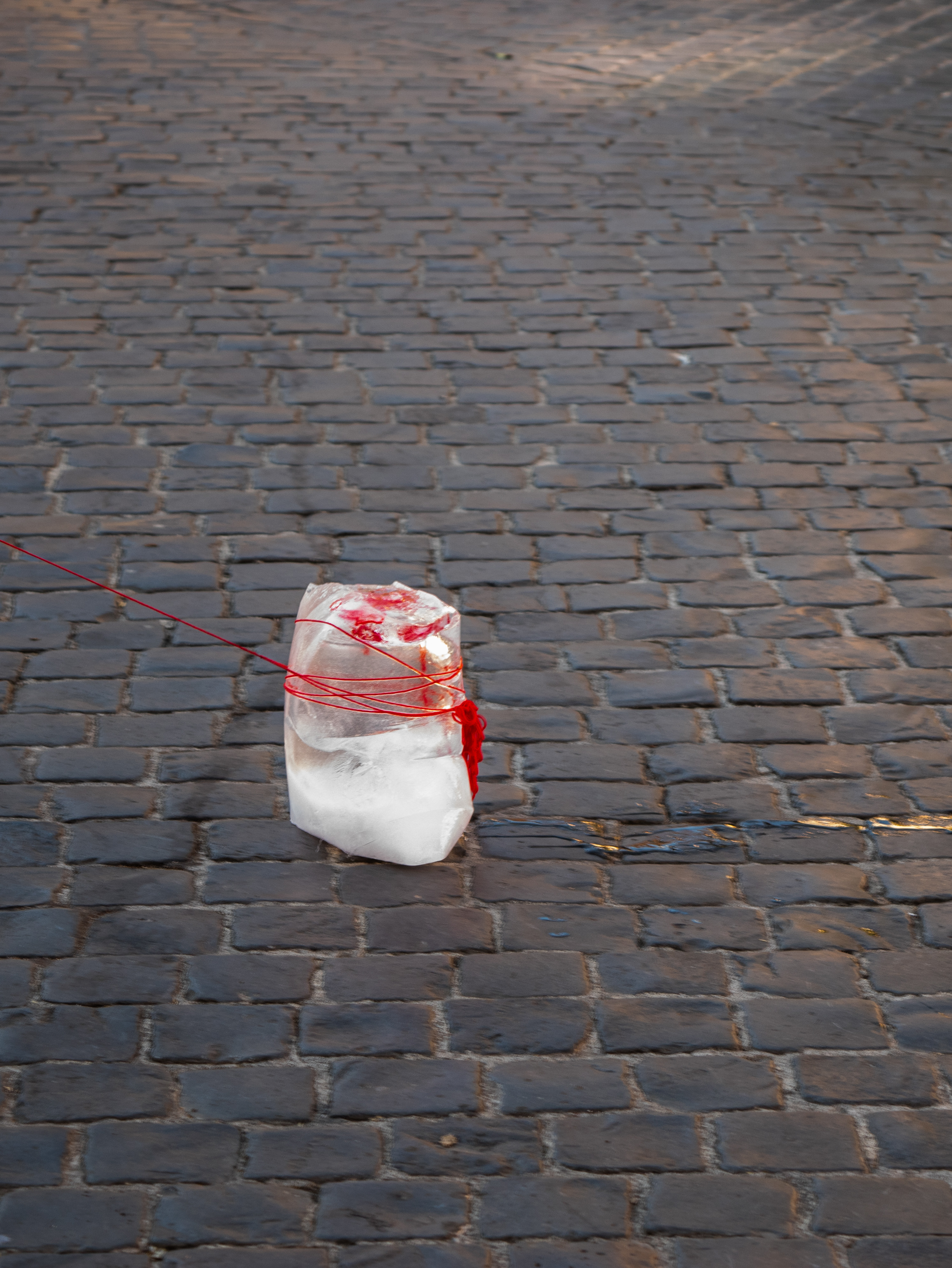 In It's Just Ice a melting block of ice is dragged through Rome, tied to a red thread of connection. Inspired by José Watanabe’s El guardián del hielo, the work reflects on love, loss, and the quiet act of holding on to what inevitably disappears.