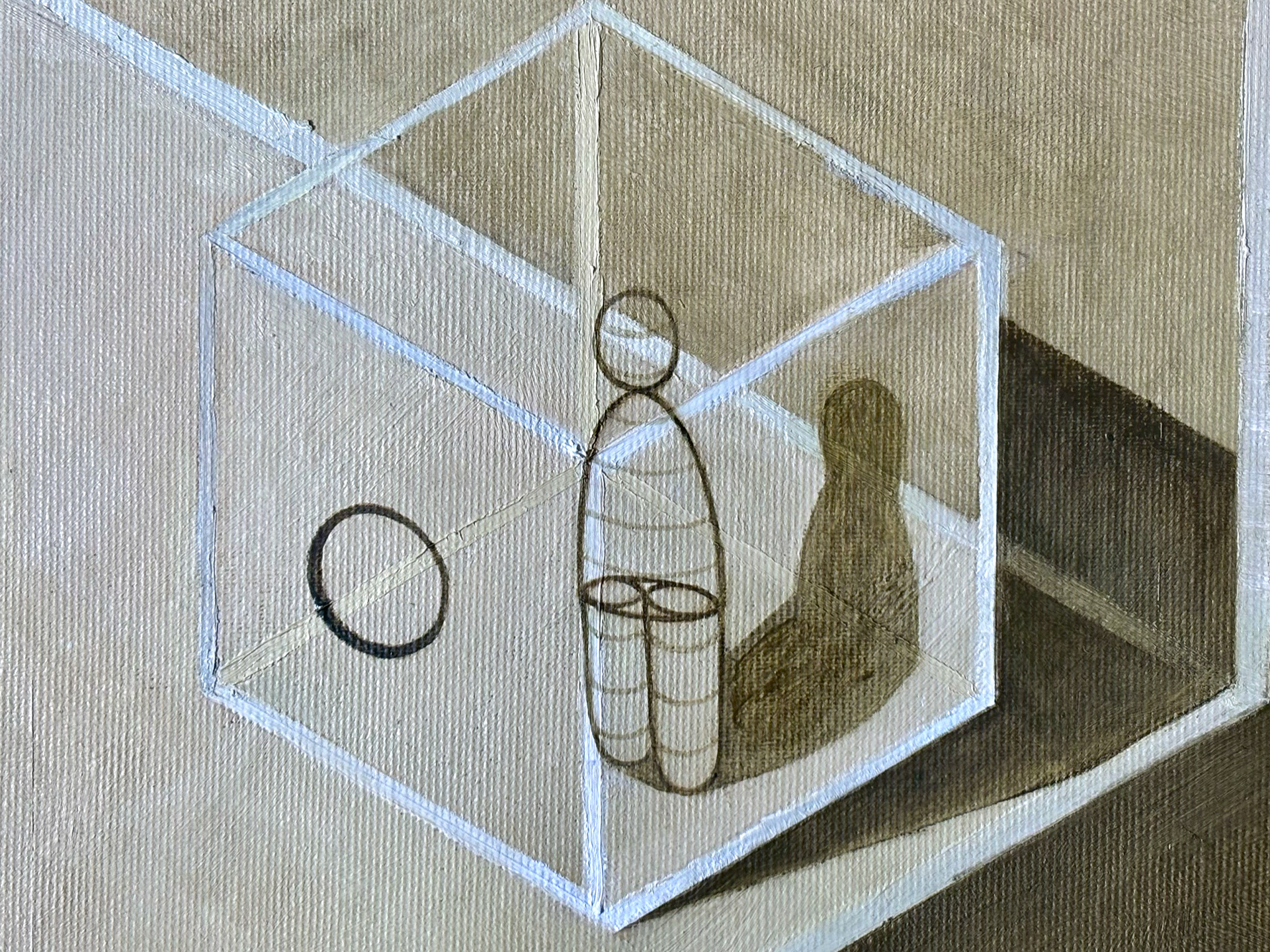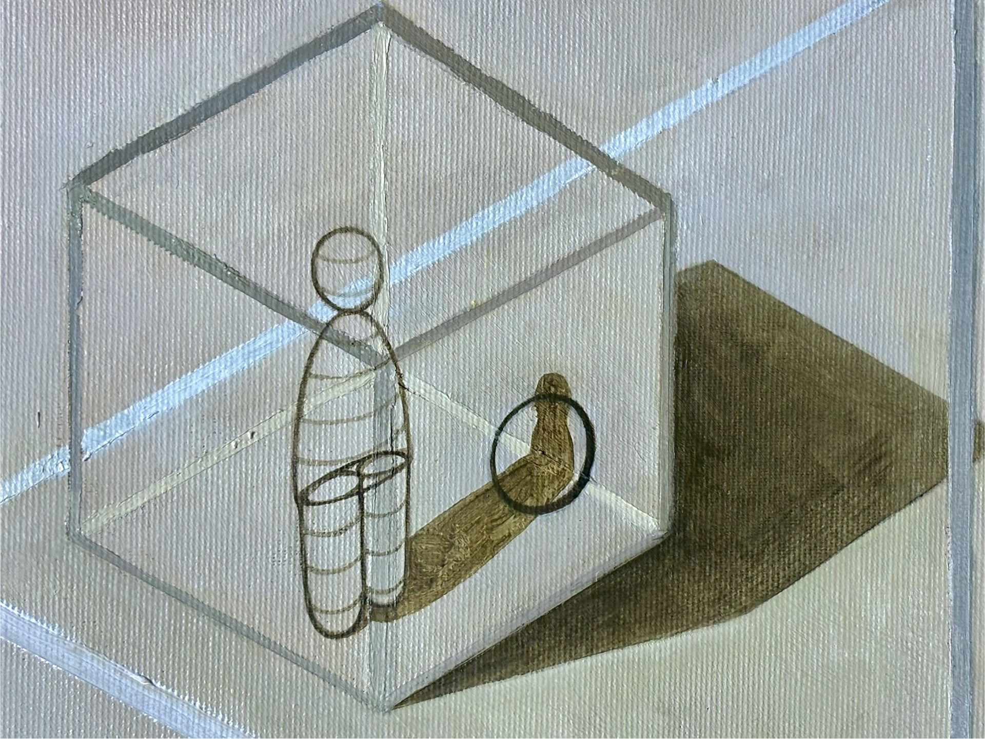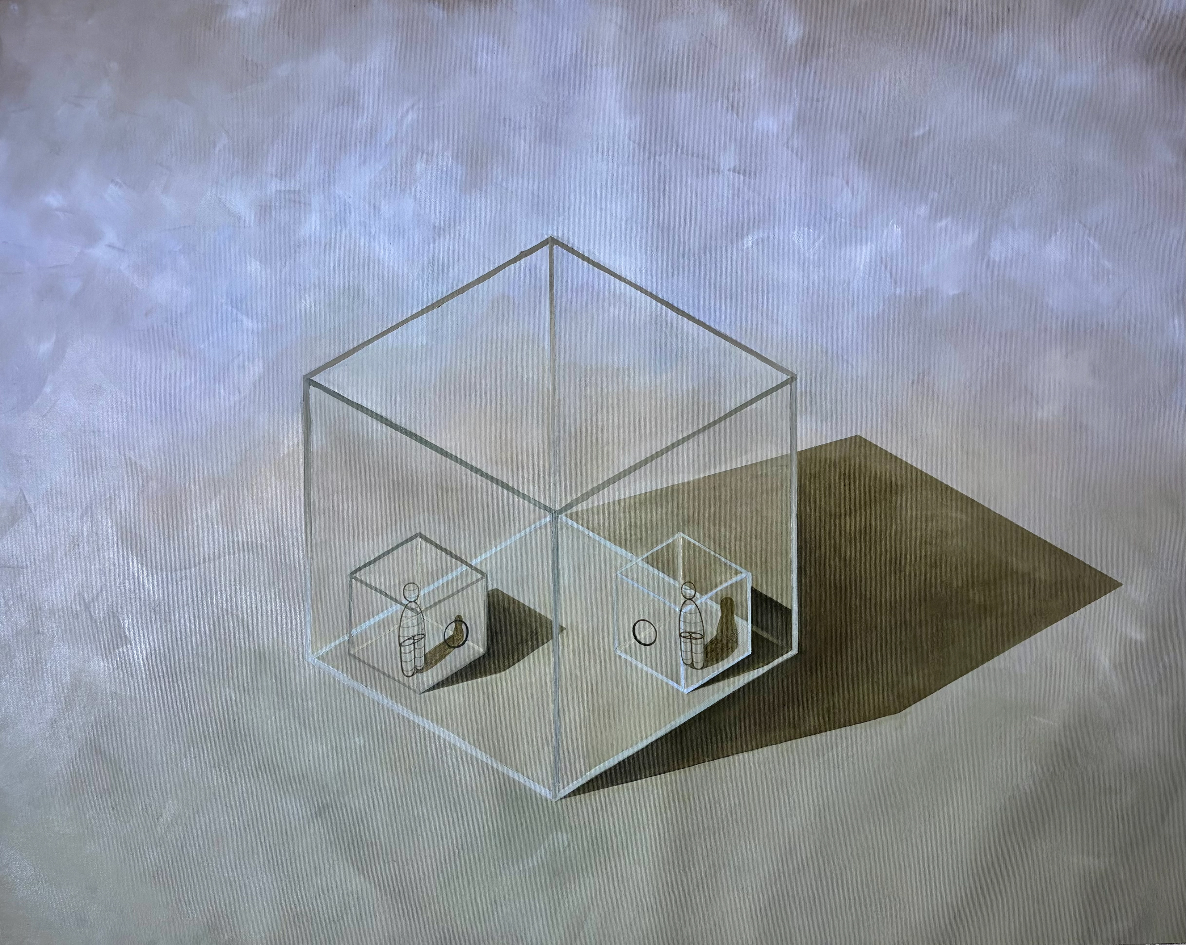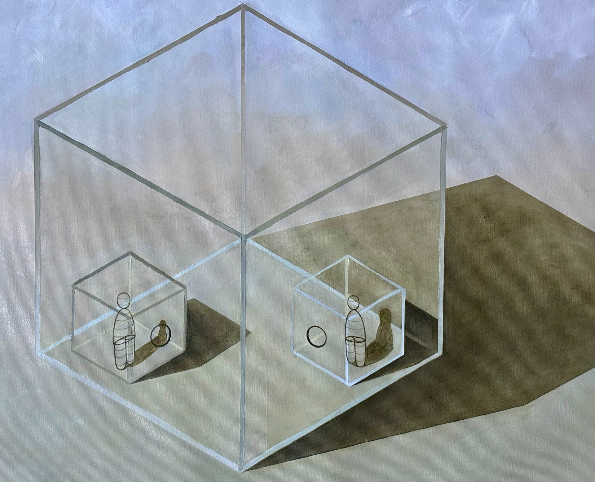 My painting seeks to evoke this sense of multiplicity as a plausible structure of existence. The figures in their cubes may be two versions of the same self, or two entirely separate entities that mirror each other across dimensions. They inhabit the same compositional space, but do not interact. They are close, but isolated, similar but never identical.