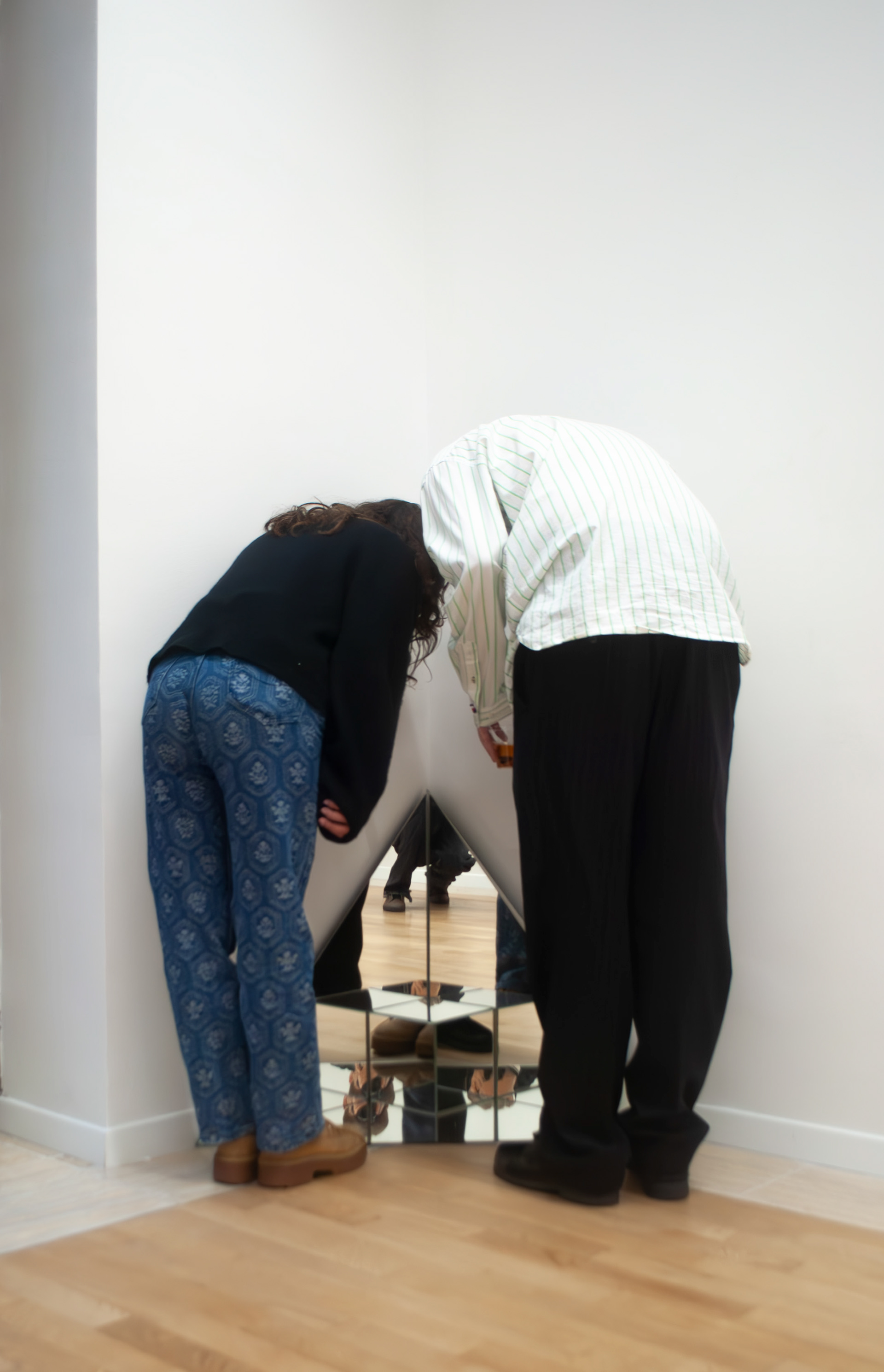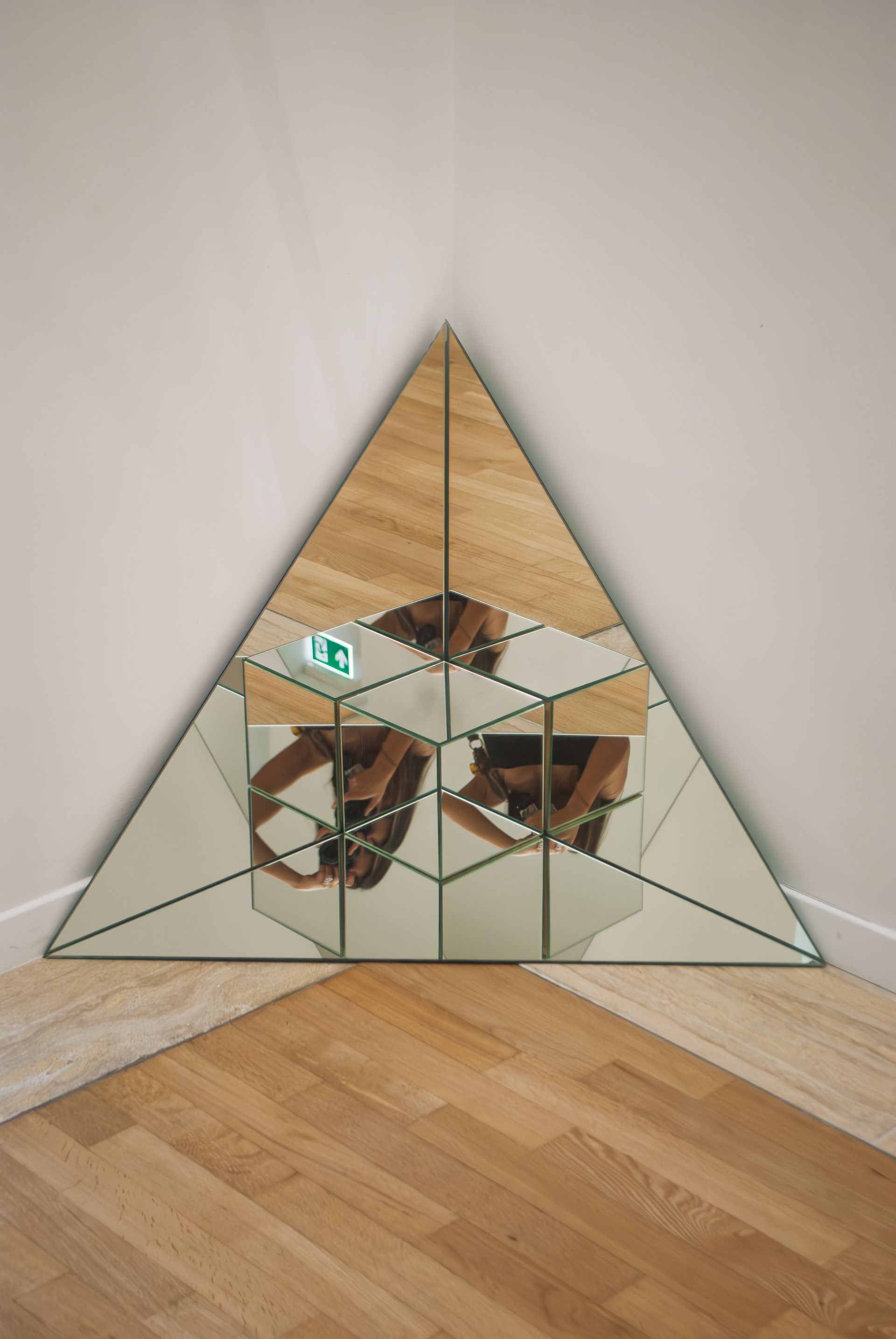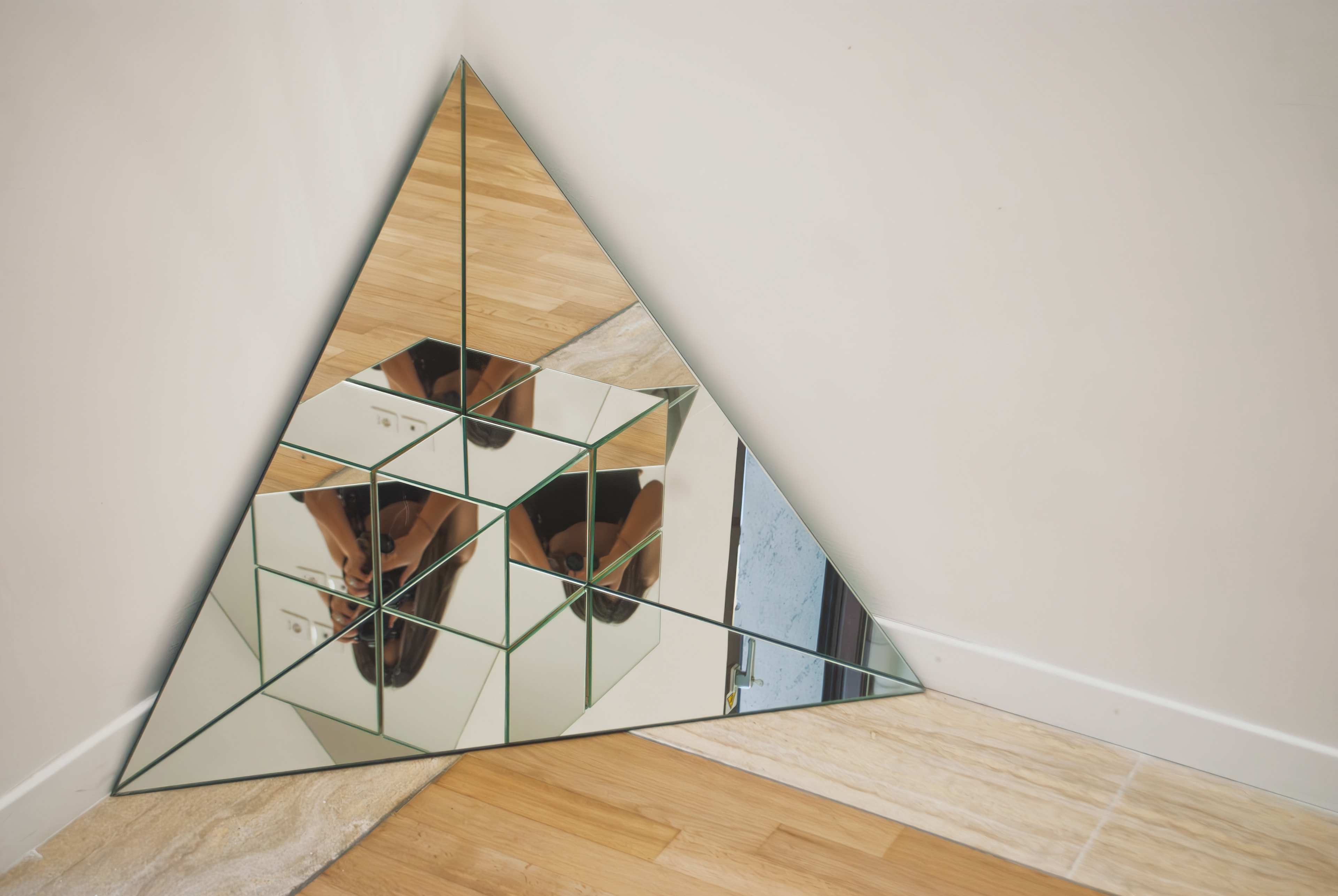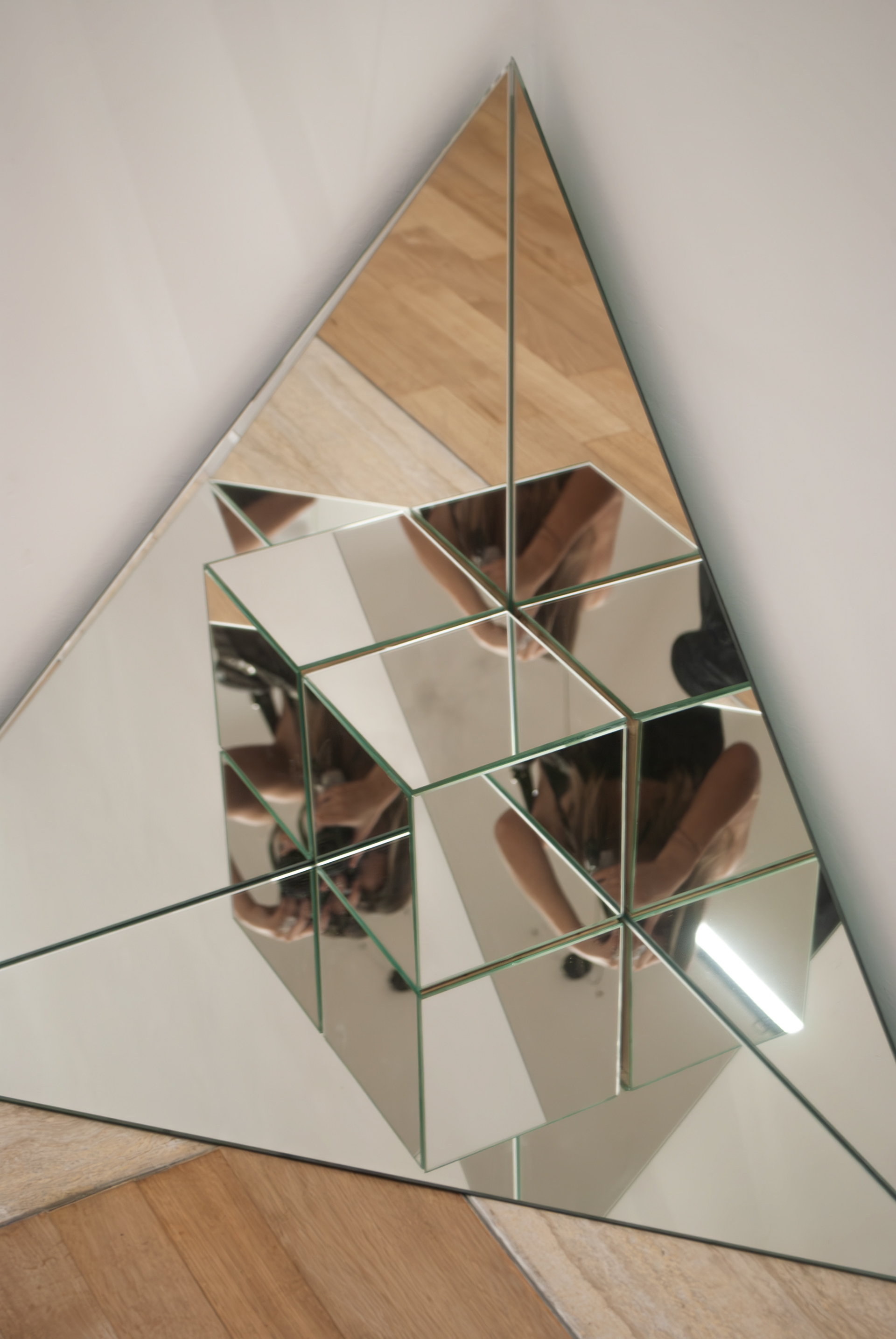 In Fragmented Realities, Mara Espinosa Erda constructs a perceptual environment where geometry, reflection, and physical presence converge. The installation consists of six mirrors: three isosceles triangular panels arranged at 90° angles within a corner, and three additional mirrored panels forming a cube positioned at their intersection.