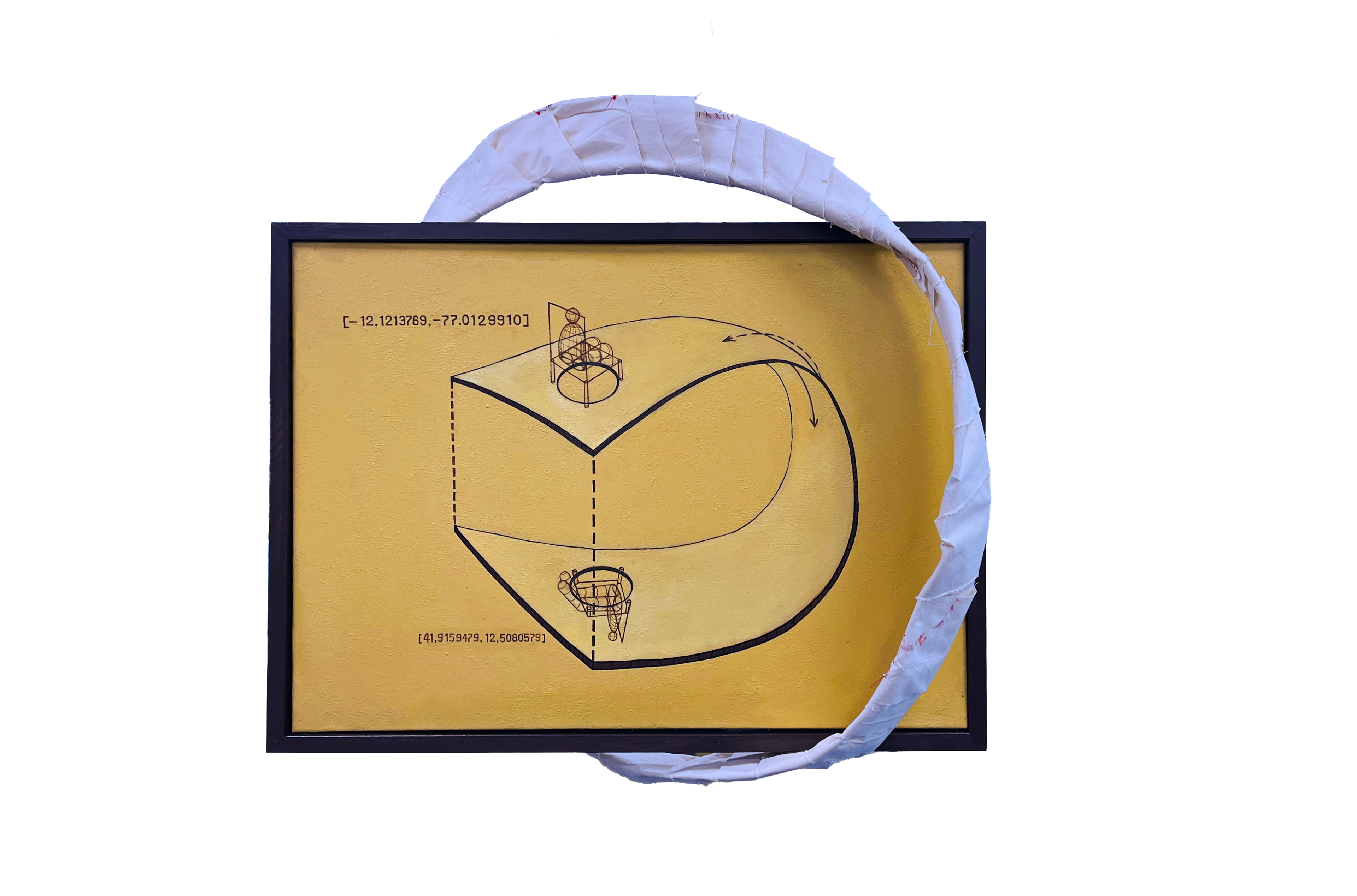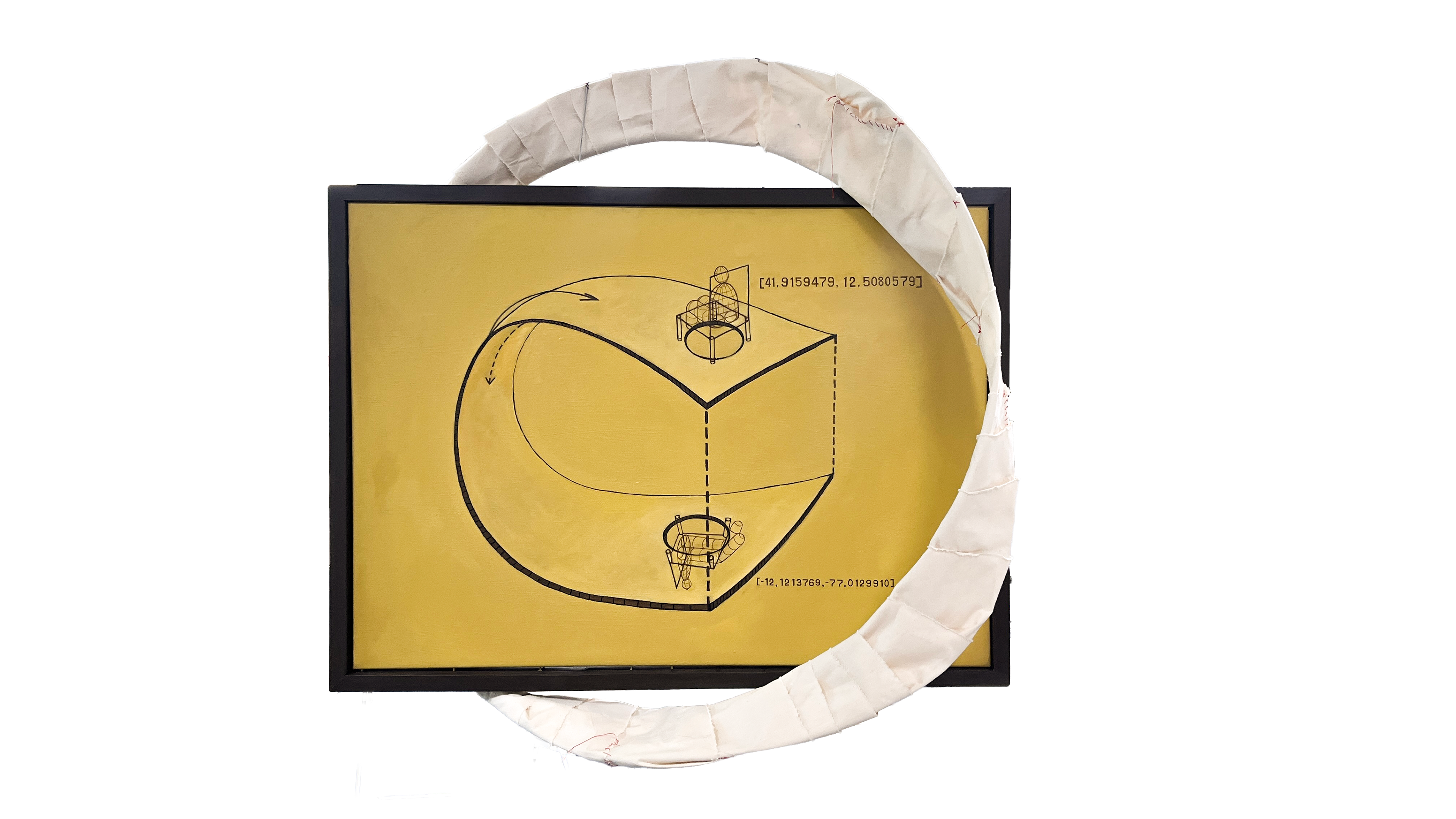 Wormhole I & II + Möbius Strip, 2025 | oil on canvas, wire and fabric, 100 x 75 cm [painting with frame]